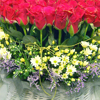 탐스러운 붉은장미와 아기자기한 소국의 조화가 돋보이는 꽃바구니입니다!