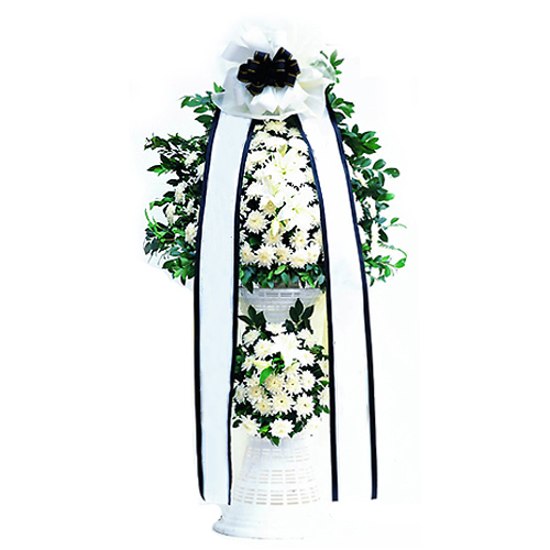 국화대국(황,백)을 사용하여 상가나 추도용으로 만든상품입니다. 도시루잎이나 모스테리아등 그린소재를 사용하고 계절에 따라 극락조, 백합, 백글라디오라스등으로 포인트를 주기도 합니다.